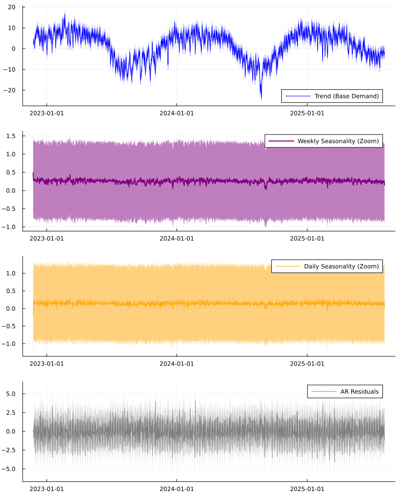 Our state vector $z_t$ has dimension $D=6$, representing: [Level, Daily_Cos, Daily_Sin, Weekly_Cos, Weekly_Sin, AR_Residual]