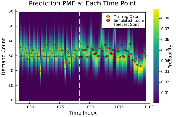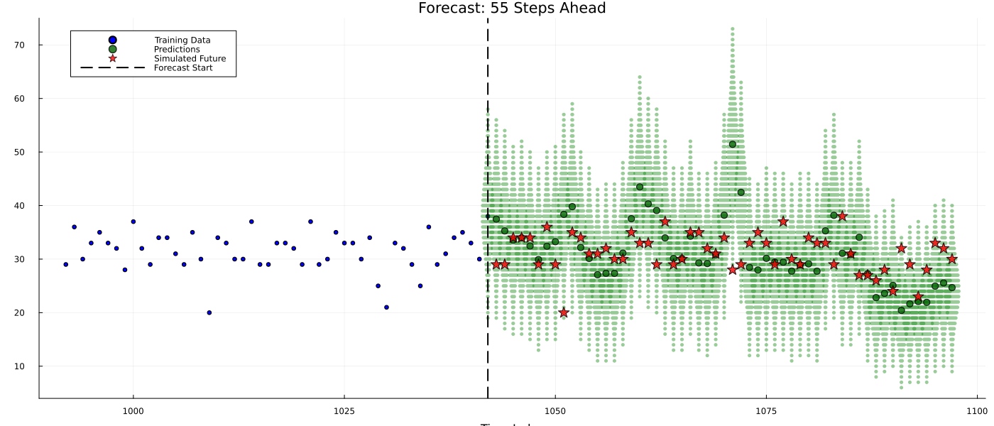 scatter!(collect(n_train_current+1:n_total_current), y_poisson_future, label="Simulated future", color=:red, markersize=3, alpha=0.8)