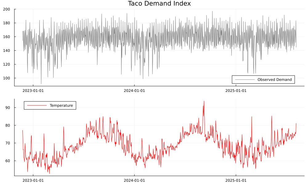 p1 = plot(dates[1:n_train], demand[1:n_train], label="Observed Demand", title="Taco Demand Index", color=:gray)
