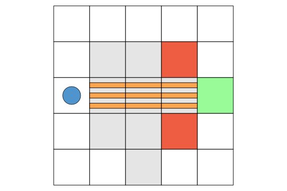 "final_state" => CartesianIndex(3, 5)Let's create an animation to visualize the agent's trajectory. Modify the grid definition or the agent's starting position to experiment with different scenarios. Keep in mind that planning has a fixed time horizon, and you might need to increase it to allow the agent to reach the goal safely.