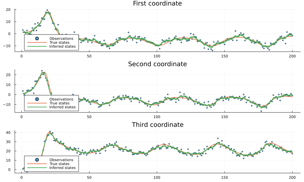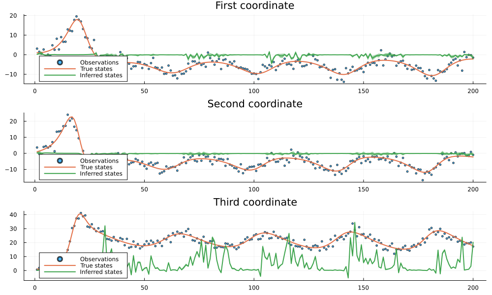 Float32[1.1312661, 1.2965654, 1.0732967])Now let's analyze the results of our neural network training. We'll visualize how well our trained model can infer the true states from noisy observations. The plots below will show the original noisy observations, the true underlying states, and our model's inferred states with confidence intervals. This comparison will help us evaluate the effectiveness of our neural network-based approach in capturing the non-linear dynamics of the system and filtering out noise.
