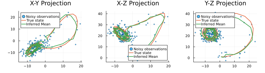 using RxInfer, Lux, Optimisers, Random, Plots, LinearAlgebra, StableRNGs, ForwardDiffIn this example, our focus is on Bayesian state estimation in a Nonlinear State-Space Model with unknown dynamics. The main challenge in this scenario is that the dynamics of the system are often unknown or too complex to model analytically. Traditional approaches might struggle with capturing the nonlinear relationships in such systems. Neural networks offer a powerful solution by learning these complex dynamics directly from data, but incorporating them into a Bayesian framework requires careful integration to maintain probabilistic interpretations and uncertainty quantification. This tutorial demonstrates how to overcome these challenges by combining the flexibility of neural networks with the principled uncertainty handling of probabilistic programming. Specifically, we will utilize the time series generated by the Lorenz system as an example.